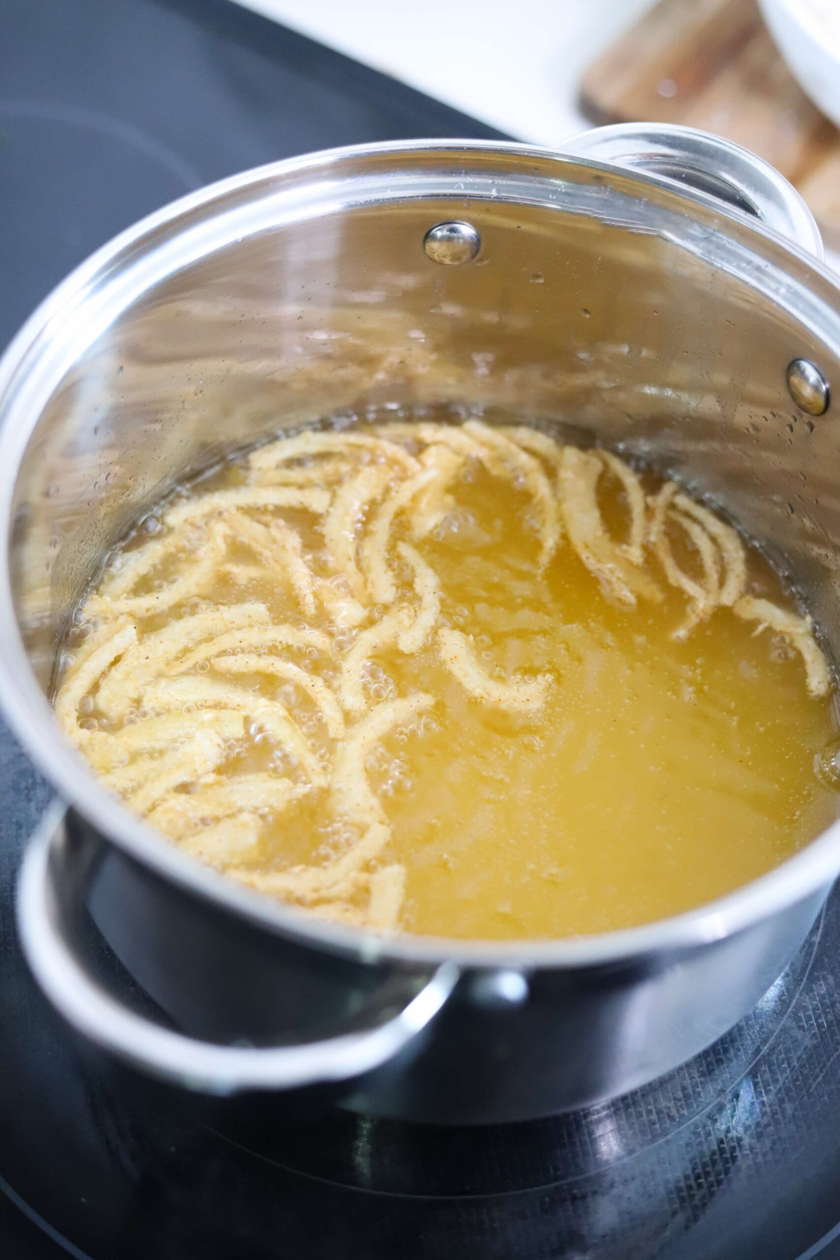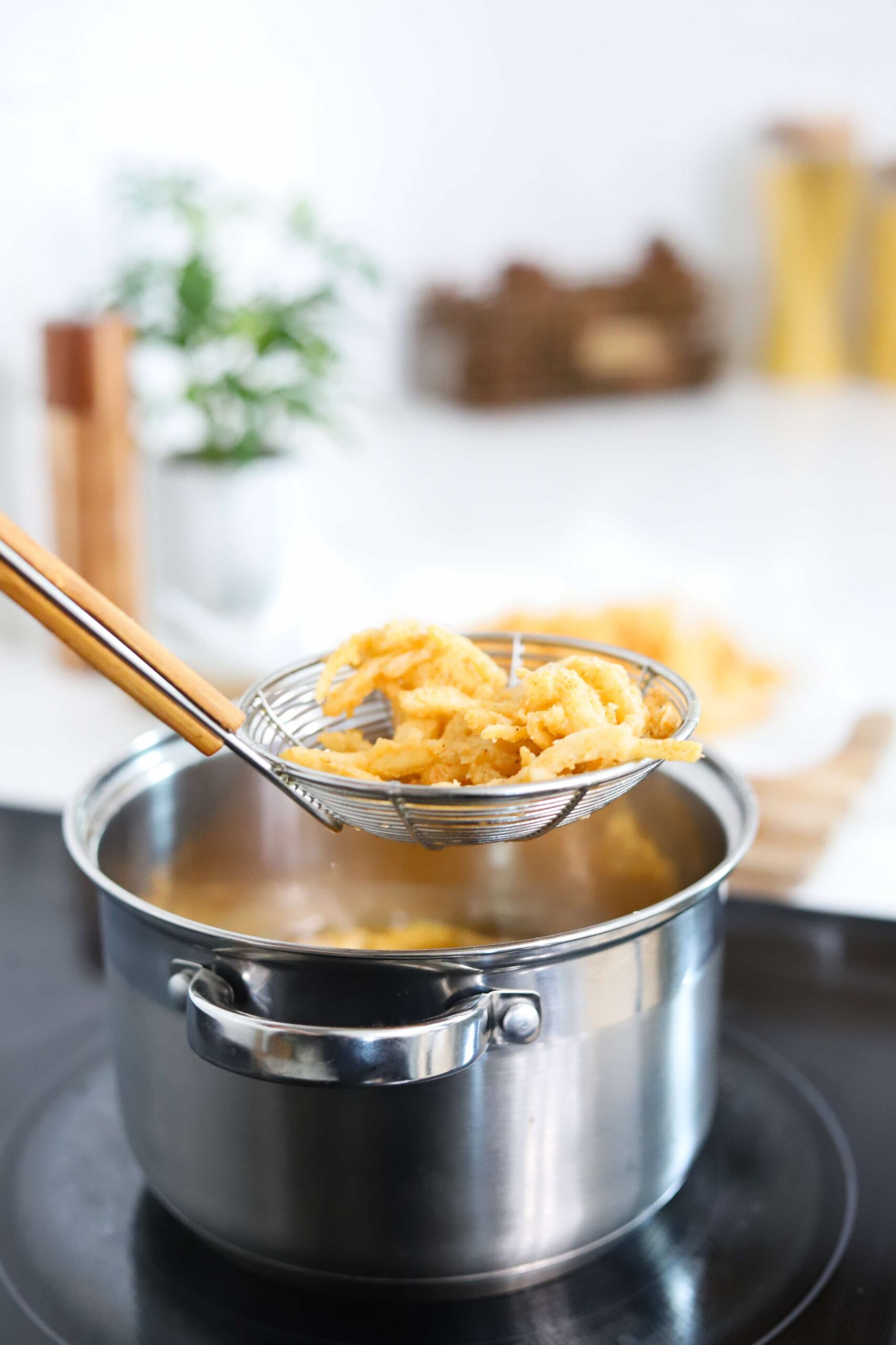 You don’t need much to make fried onion straws, but you do need about an hour of wait time. They are totally worth the wait though. I promise.