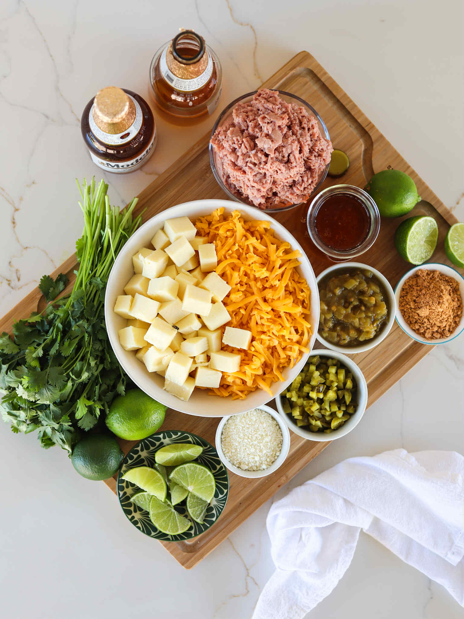 - Shred or cube 12 ounces of oaxaca, asadero or white American cheese and 8 ounces of sharp cheddar and set aside for now
