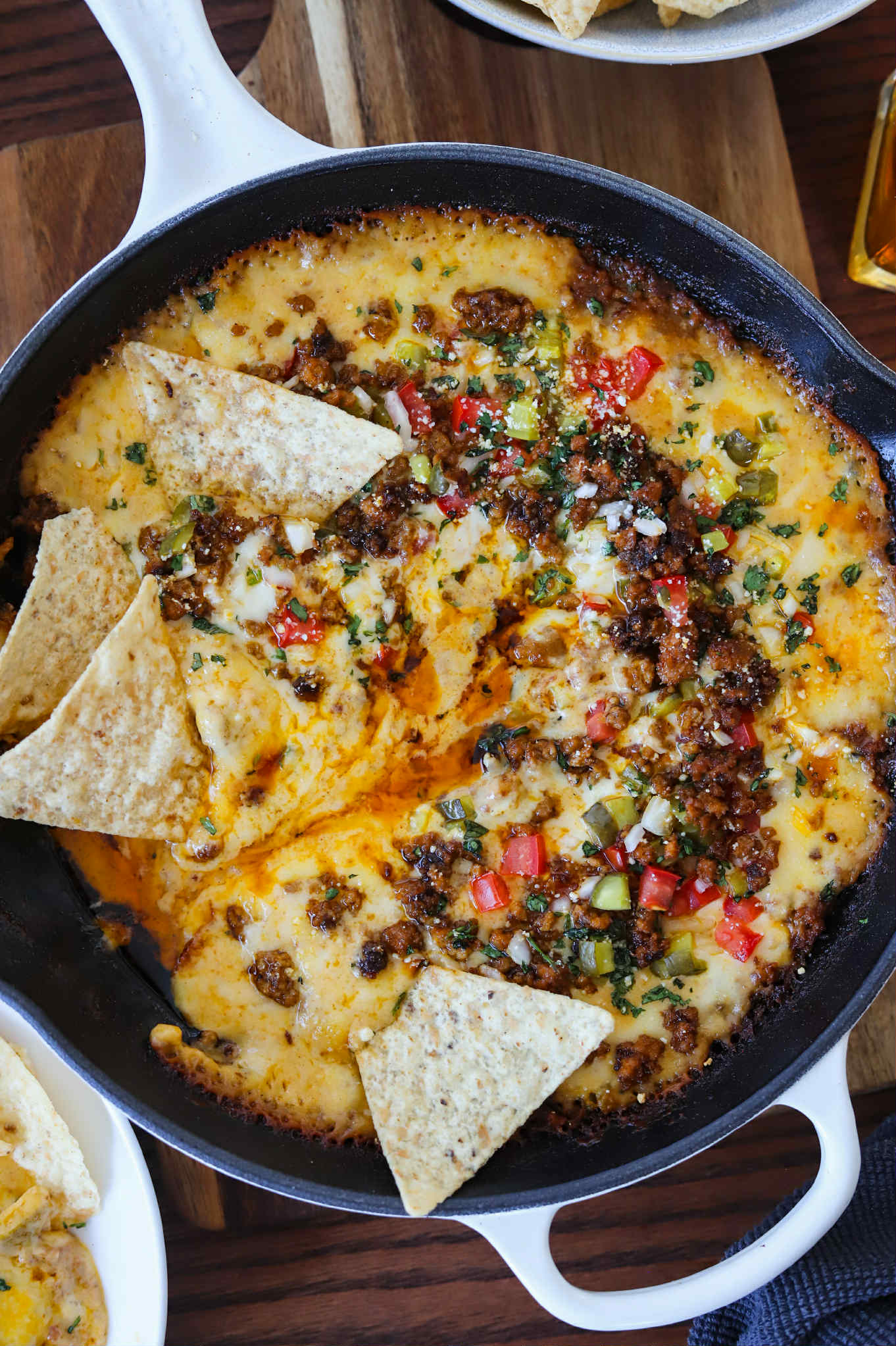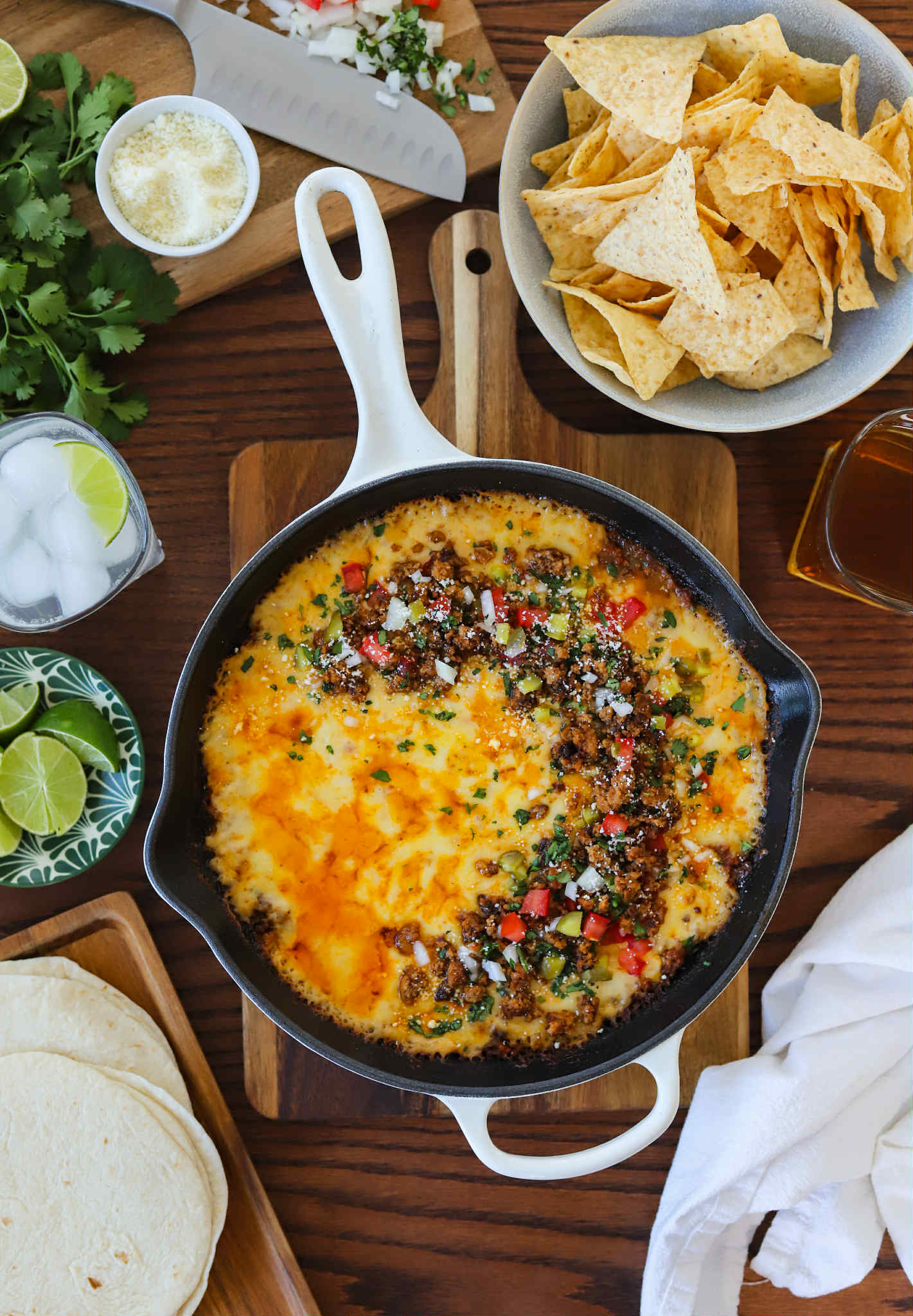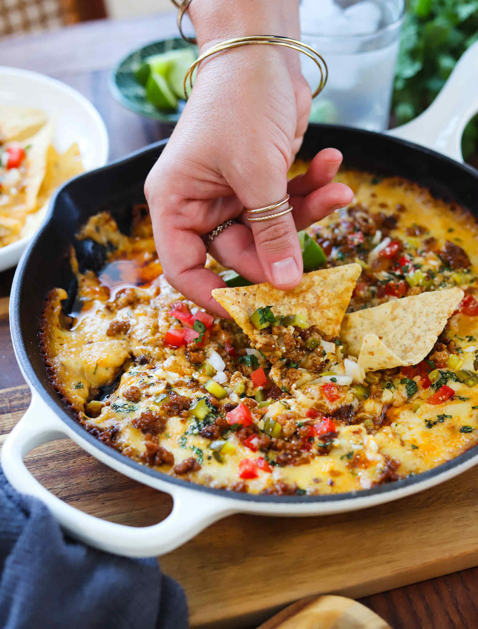 Queso fundido is also a melted cheese dip, but this one begins with seasoned ground meat browned in a skillet and all of the other ingredients are tossed in and everything melts down into a thick, bubbly, caramelized dip in the oven. No babysitting required and this dip maintains its fabulous consistency for much longer than regular queso, but can also be popped back into the oven at any point.