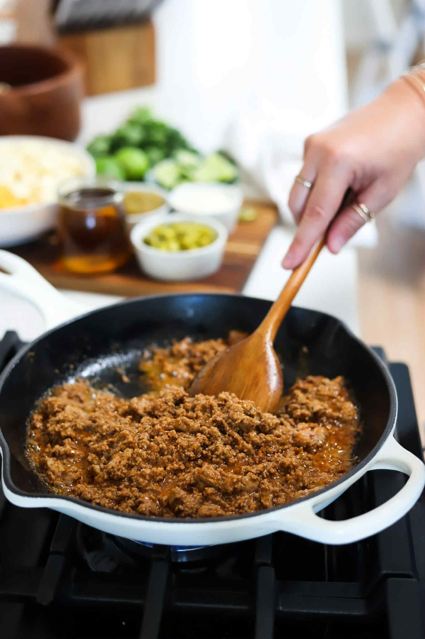 - Season the ground pork generously with your favorite taco seasoning and cook until brown and crispy and then drain the excess fat from the skillet