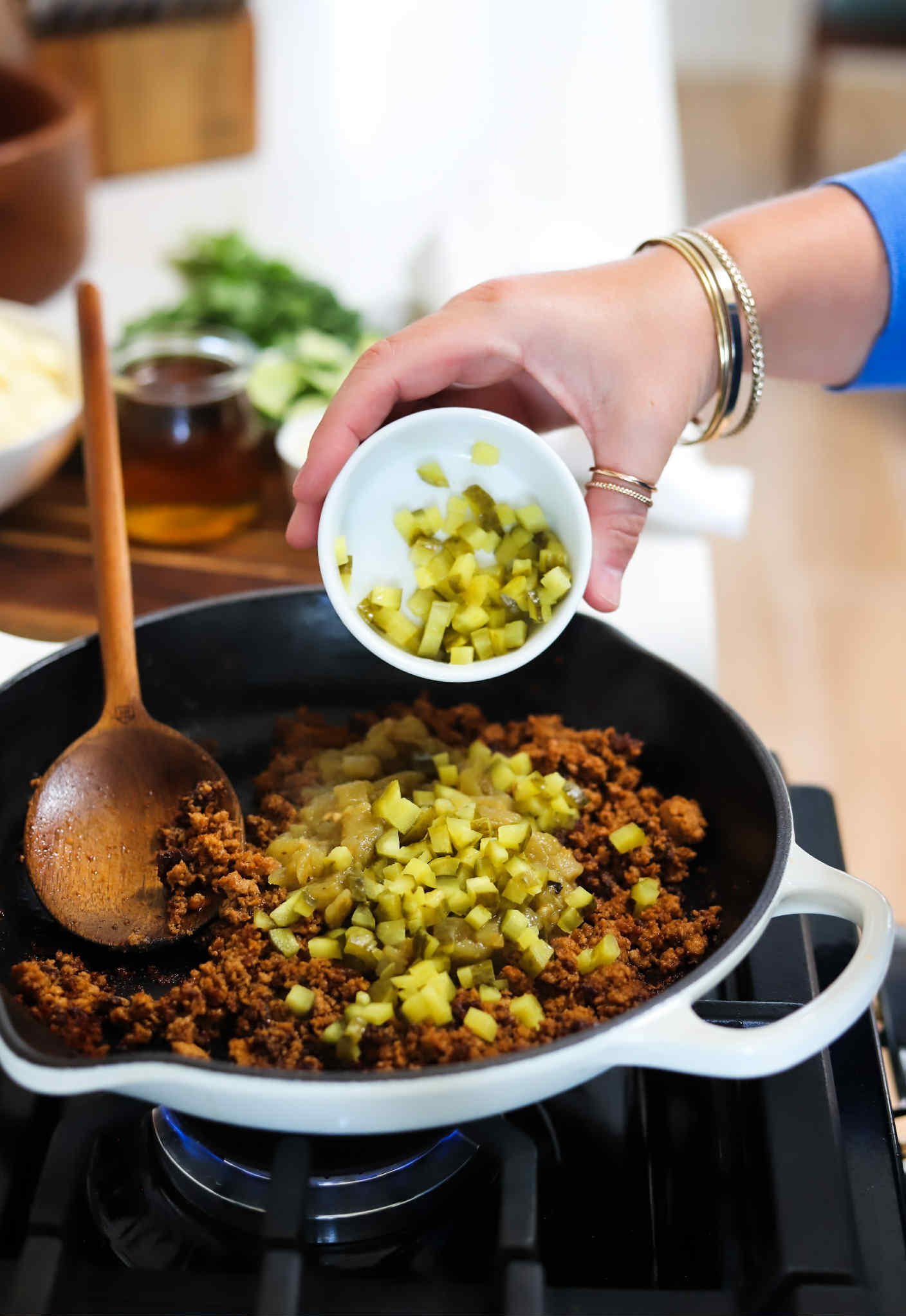 - Add 1/2 cup of beer, broth or milk, 1/2 cup of diced dill pickles and 7 ounces of diced green chilies and use a wooden spoon or spatula to work up any of the browned bits from the bottom of the skillet