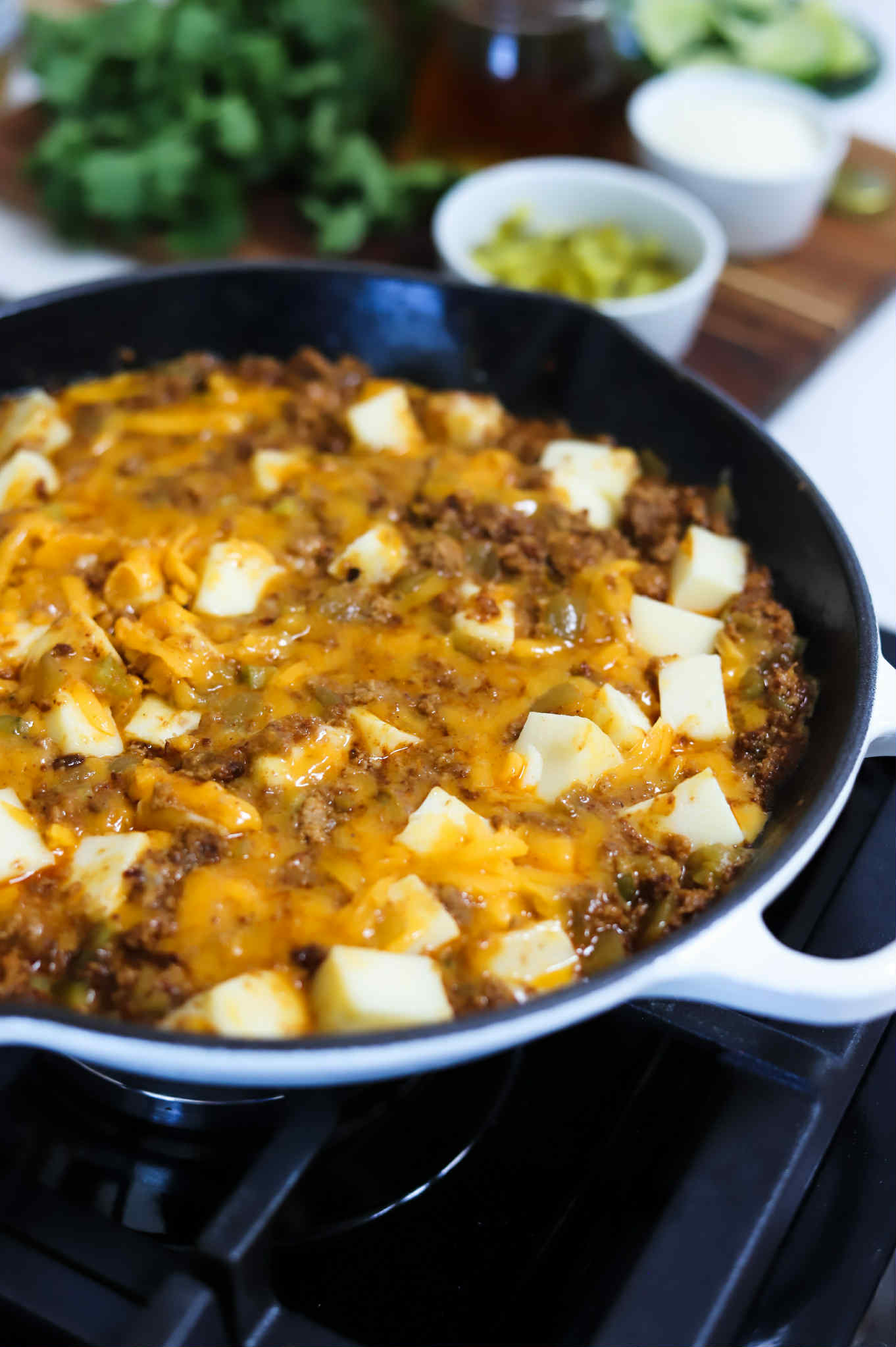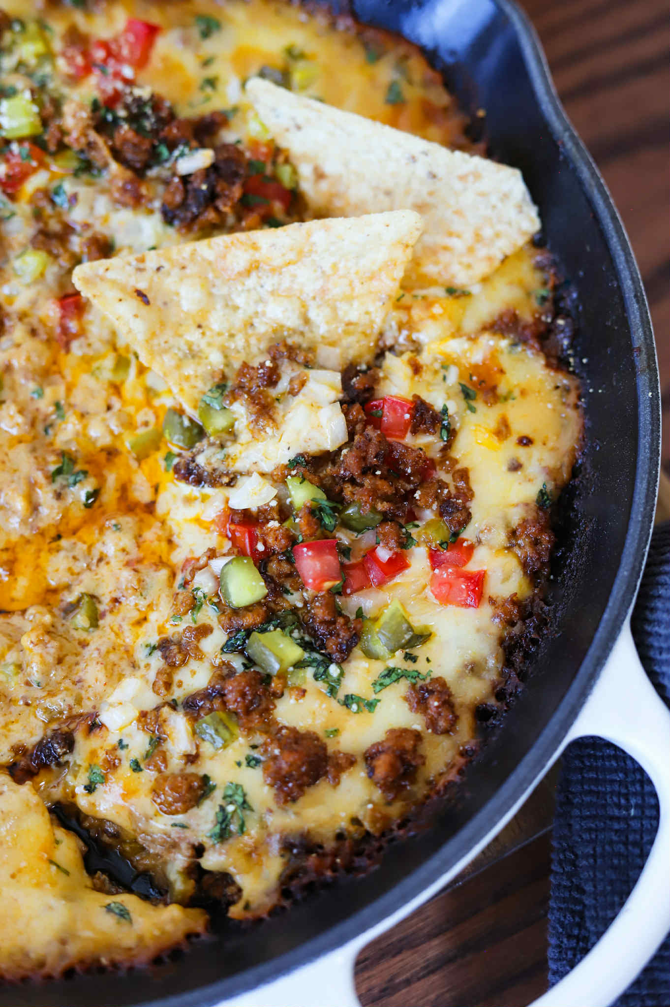 I like to reserve a little extra crispy ground pork to add over the top right after I pull the skillet out of the oven. I also garnished this beauty with more diced pickles, diced tomatoes, onion and some fresh cilantro.