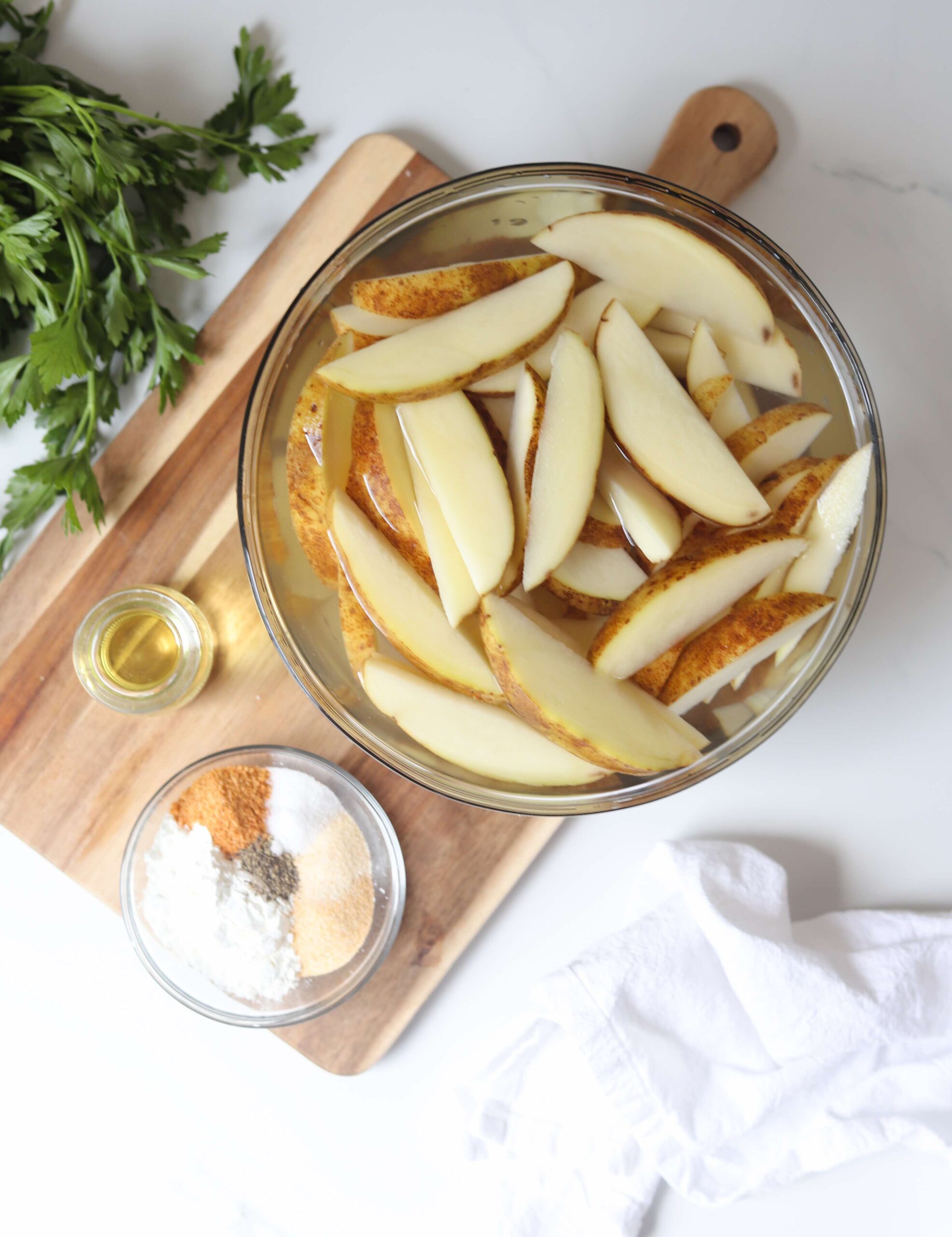 Place all of the wedges into a large bowl and add enough cool water to cover all of them. Let them soak for 45-60 minutes. This will help draw out excess starch from the potatoes and will allow them to achieve maximum crispiness.