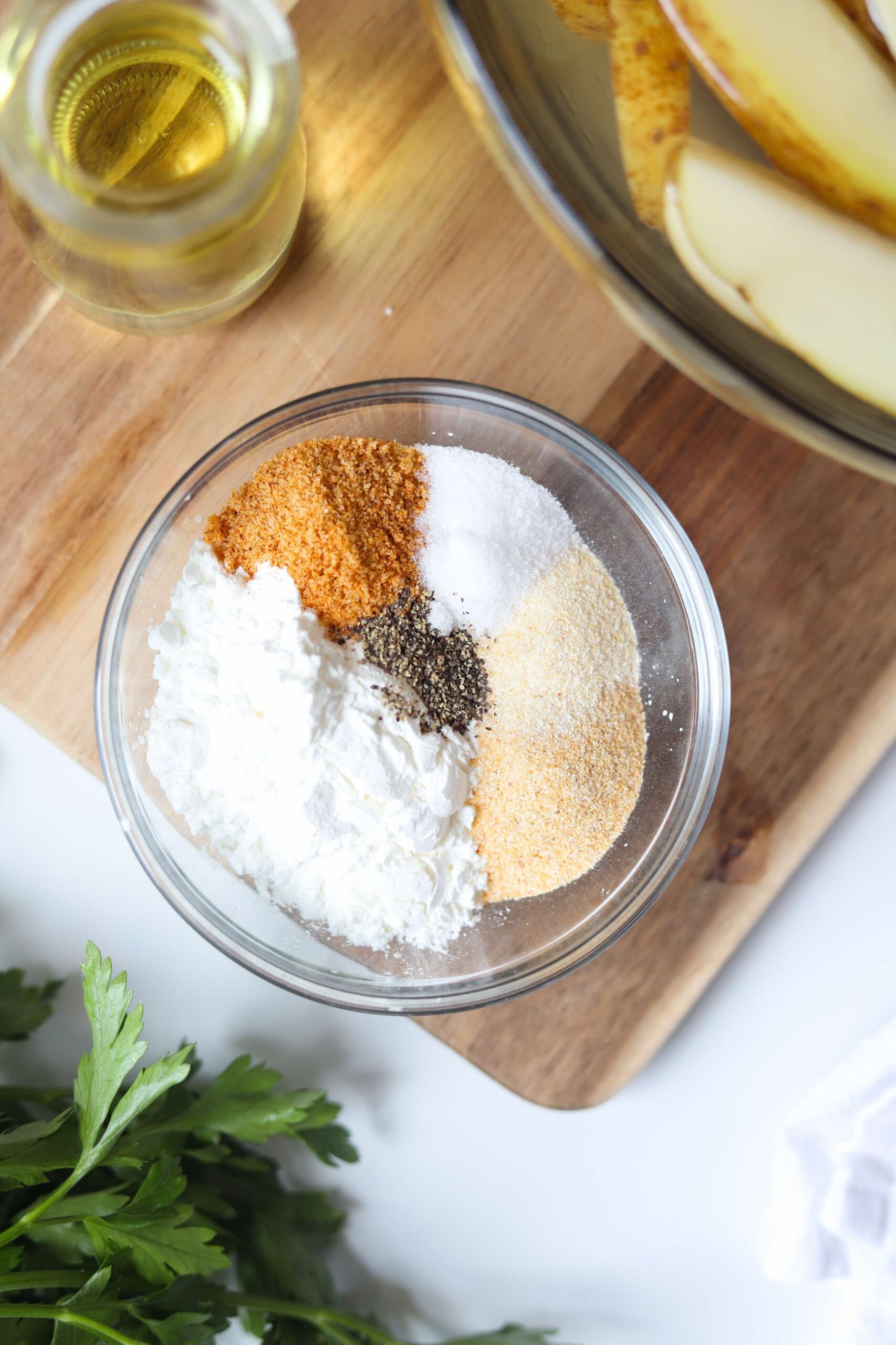 - Once all of the potatoes are dried, drizzle with 2-3 tablespoons of neutral oil and add the cornstarch and seasoning into the bowl and toss until all of the wedges are all generously coated