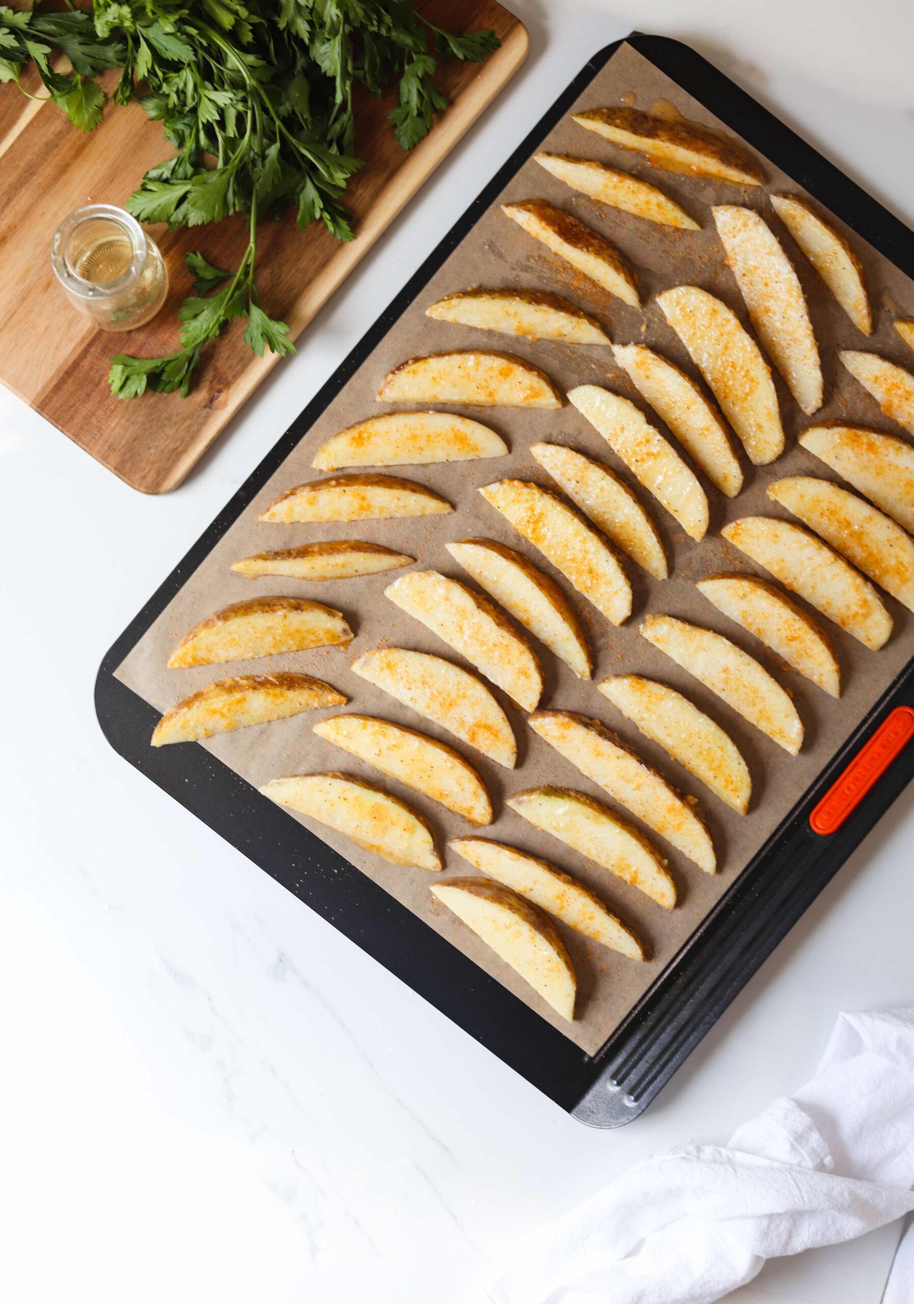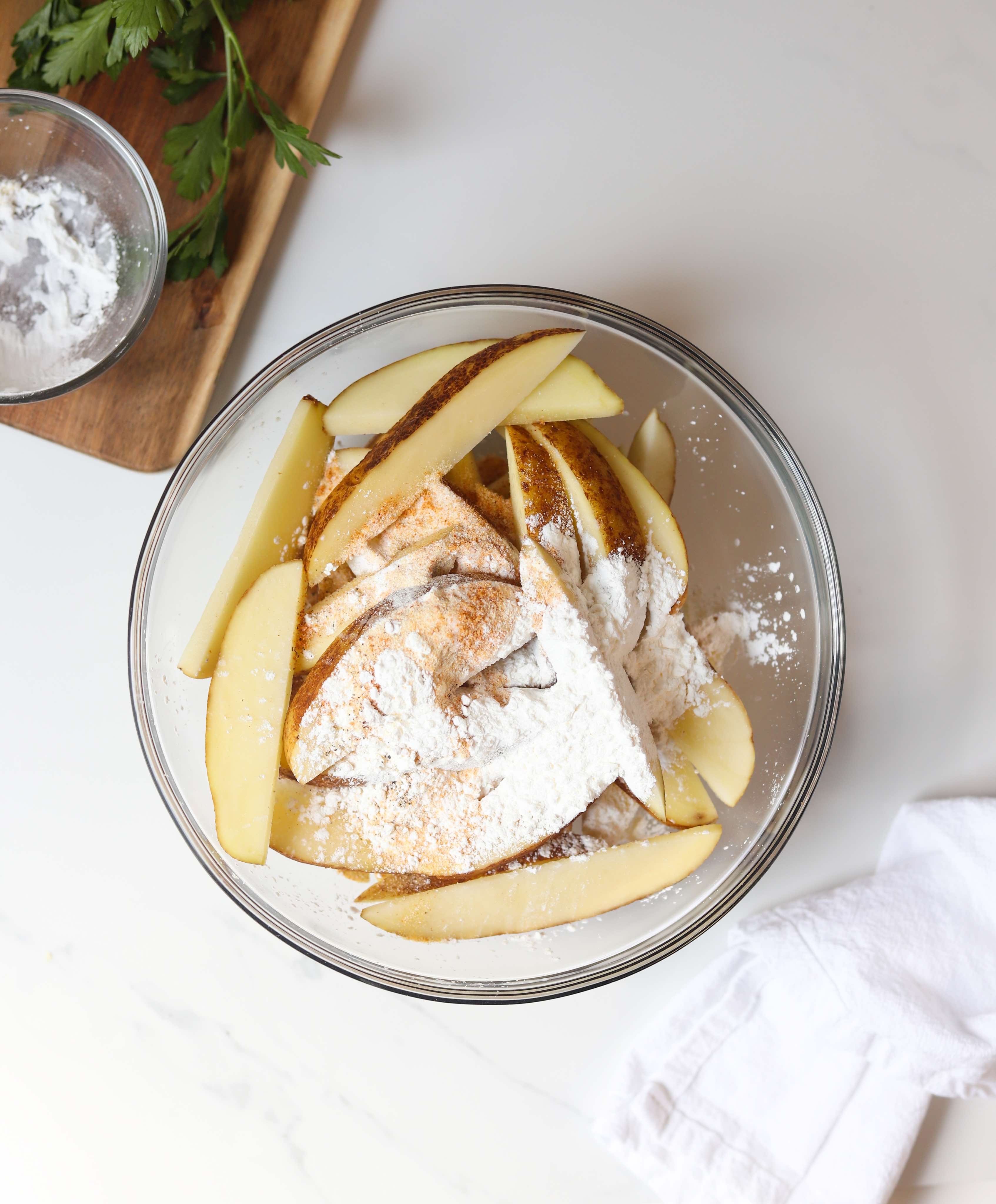 Drizzle the dried potato wedges with 2-3 tablespoons of a neutral oil and add then add the cornstarch and seasoning. Toss until all of the wedges are coated and then transfer them onto a parchment lined baking sheet leaving a little bit of space between each wedge.