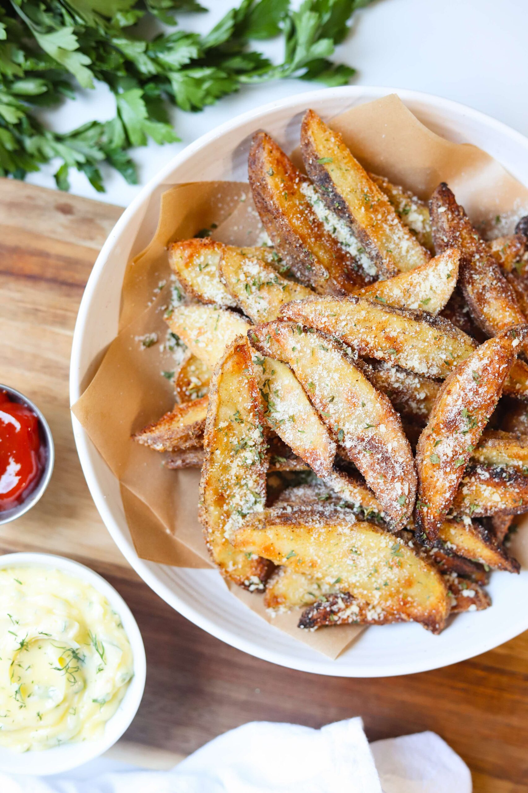 - Grate fresh parmesan over the hot crispy potato wedges and sprinkle with finely chopped parsley and salt