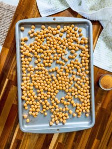 Once the skins are removed, get rid of them and transfer the chickpeas onto a rimmed baking sheet. If you are making 1 can of chickpeas, a little cookie sheet is fine, but if you are making a larger batch, be sure to use a large baking sheet so the chickpeas have room to spread out.