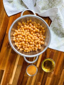 Note: If you are new to this situation, I suggest doing this on a baking sheet to avoid chasing escaping chickpeas rolling around the floor.