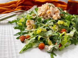 When chickpeas are drizzled in olive oil, seasoned and roasted in a hot oven, they develop the most wonderfully crisp texture that really does add that special crunch factor that a crouton brings to a salad. So, the next time you are looking to add something special to your salad or simple want a healthy snack, roast up a batch of these crispy spiced chickpeas. They are the best!