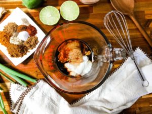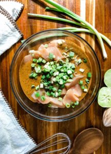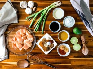 Combine all of the marinade ingredients together in a small bowl and whisk until they are fully incorporated. Pour the marinade over the chicken and toss until every piece of chicken is fully coated. Cover the bowl tightly with plastic wrap and chill the chicken in the refrigerator for anywhere from 30 minutes to 3 hours. The longer it goes, the better it will become, but if you only have 30 minutes to spare, you will still get a delicious result.