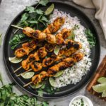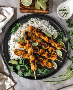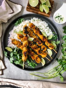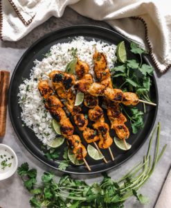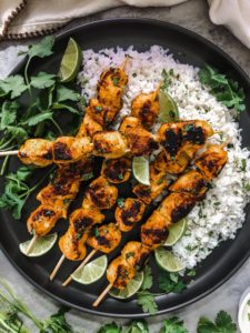 I usually serve these skewers with some fluffy white rice that I add a squeeze of fresh lime, some finely chopped cilantro and a pinch of garlic salt into with some cilantro lime crema on the side. Garnish them with cilantro and a few lime wedges and enjoy the flavorful curry goodness.