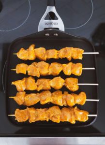 Cook them for 2-3 minutes on the first side and then rotate them. Increase the heat to medium high once both sides of the chicken have been cooked for 2-3 minutes over medium heat. Starting over medium will give the chicken a chance to cook through before charring. If you place them directly over a hot griddle, they will look charred and crispy on the outside, but may still be pink along the skewer.