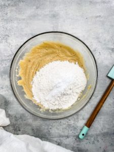 Add 2 cups of all purpose flour, 1/2 teaspoon of baking soda and 1/2 teaspoon of salt and mix until just combined.