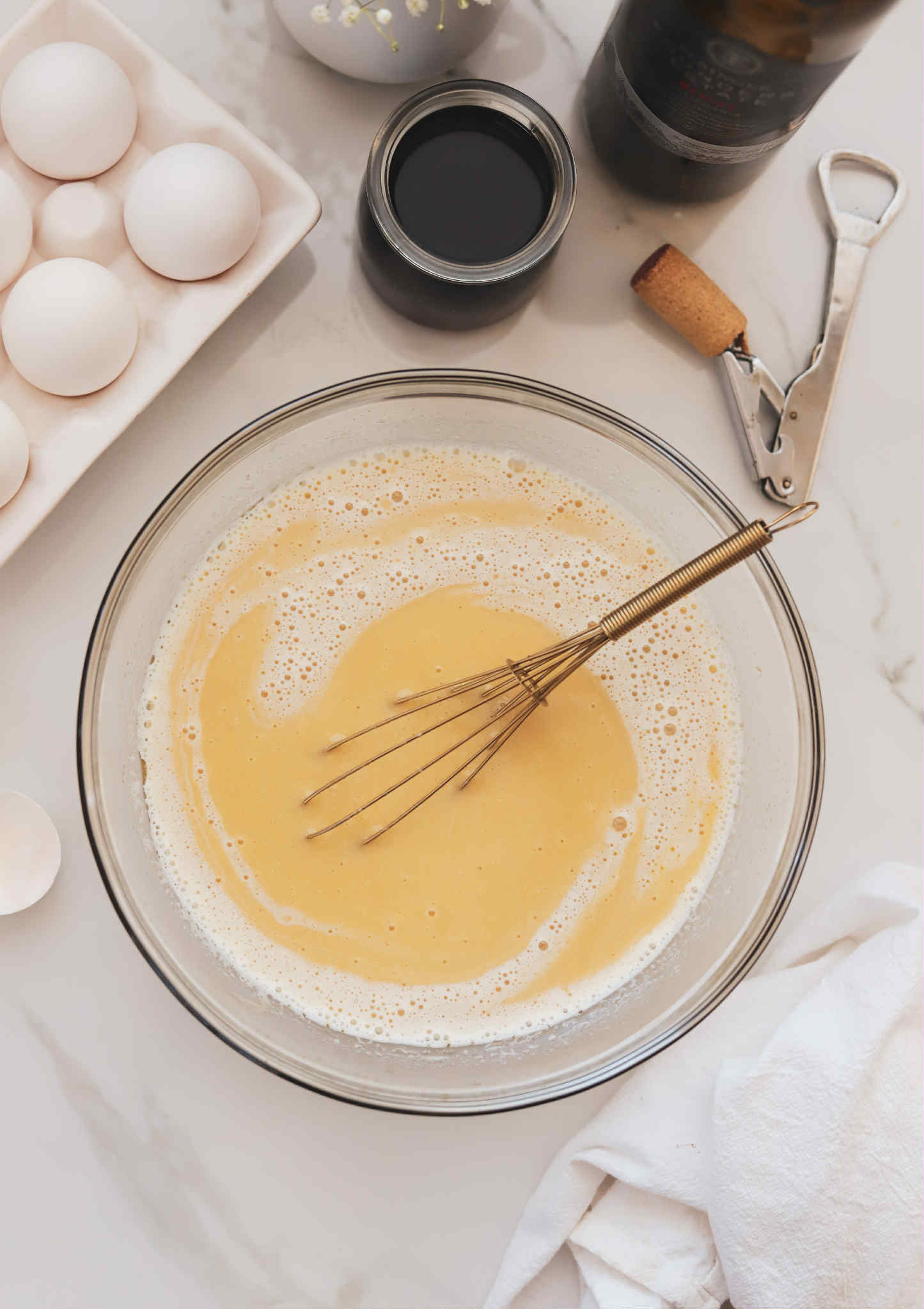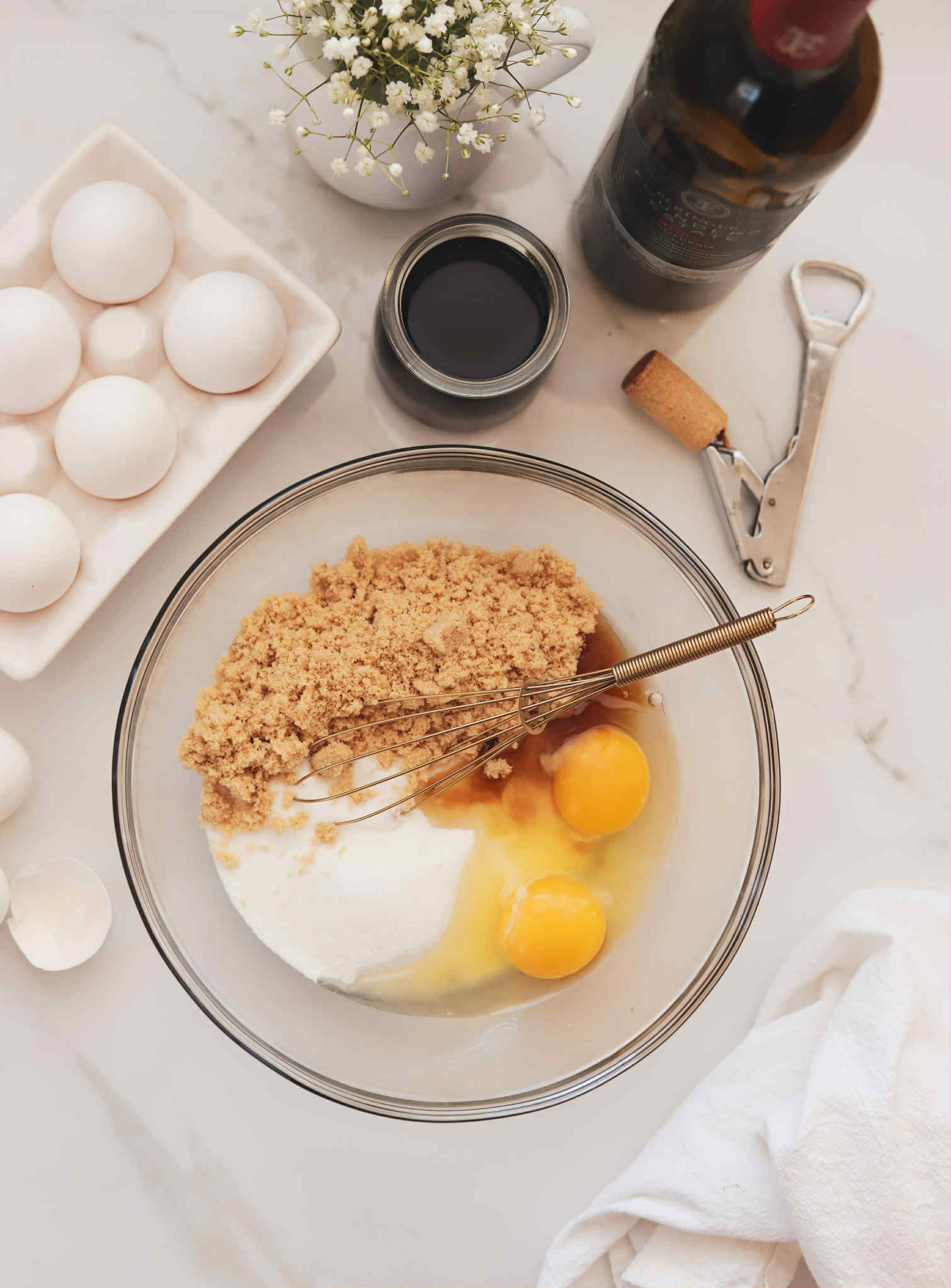 - In a large bowl, whisk 1 cup of granulated sugar and 1/2 cup of brown sugar with 2 large eggs until fully combined