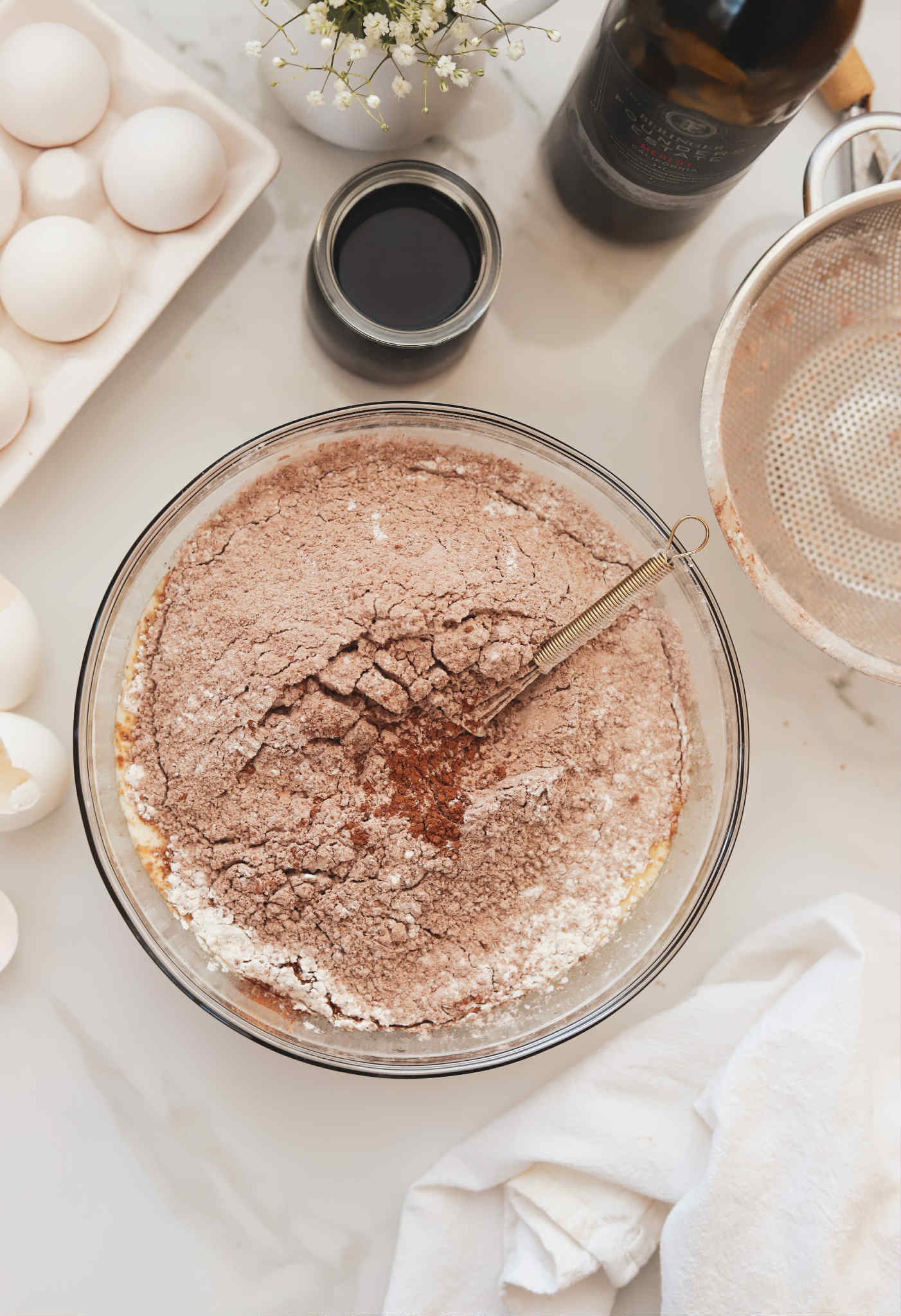 - Sift 1 3/4 cups of all purpose flour, 3/4 cup of dark chocolate cocoa powder, 1 1/2 teaspoons of baking soda, 1 teaspoon of baking powder and 1/2 teaspoon of salt into the bowl and mix until just combined