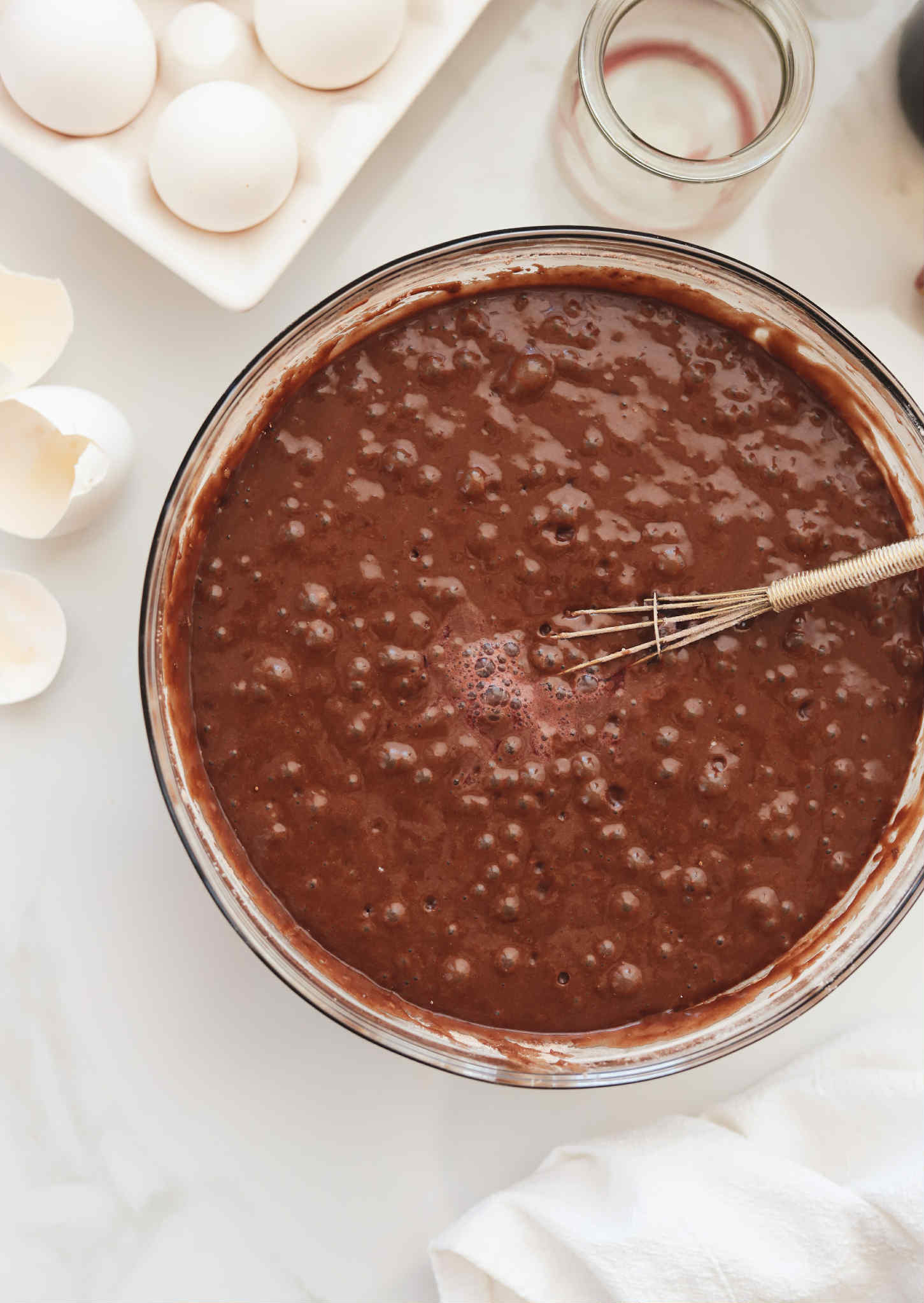 Now we are finally at the “add the wine” stage. Whisk a cup of your favorite red wine into the batter. I recommend merlot, but a pinot noir, cabernet sauvignon or syrah will all work good too. Just make sure it is something you would like to drink and this cake will turn out fabulous.