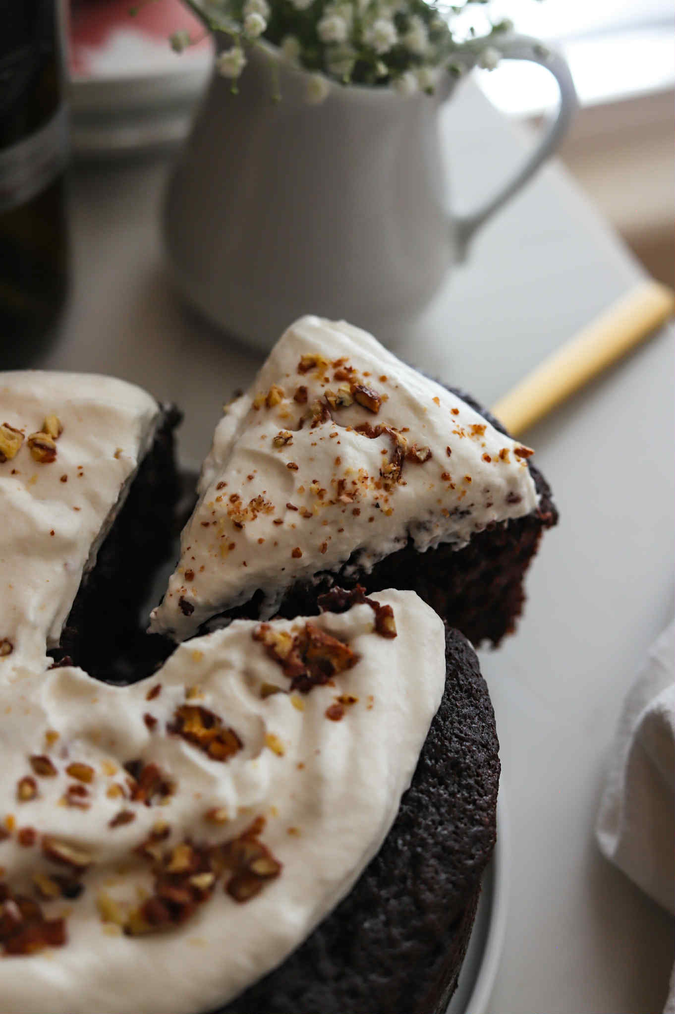 This cake is special. As soon as you transfer it out of the cake pan, you can feel how moist and airy it is going to be. The texture is fantastic and the red wine and dark chocolate cocoa powder pair so well together that you may never make chocolate cake the old fashion way ever again…