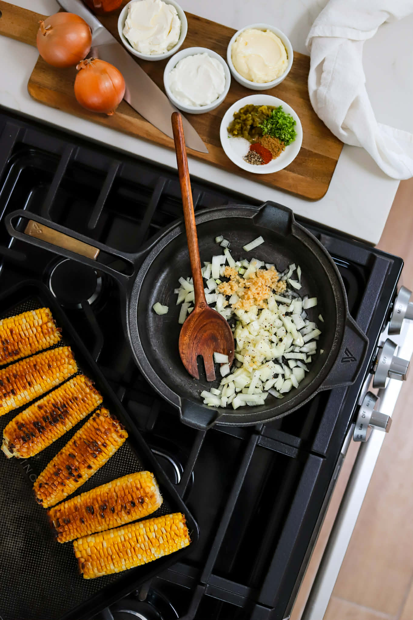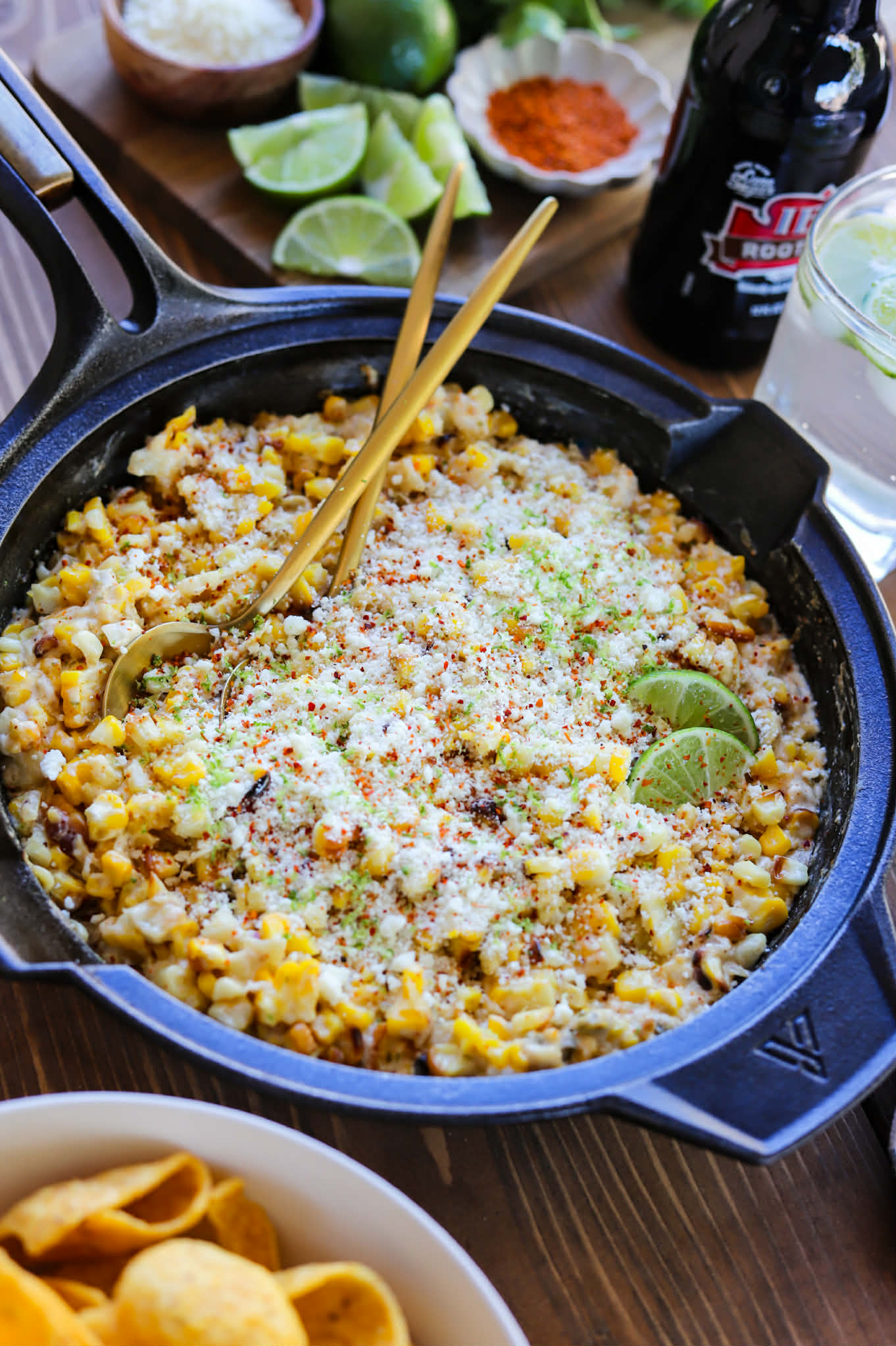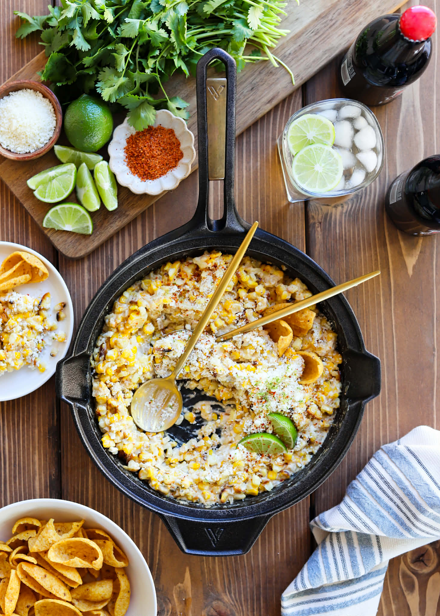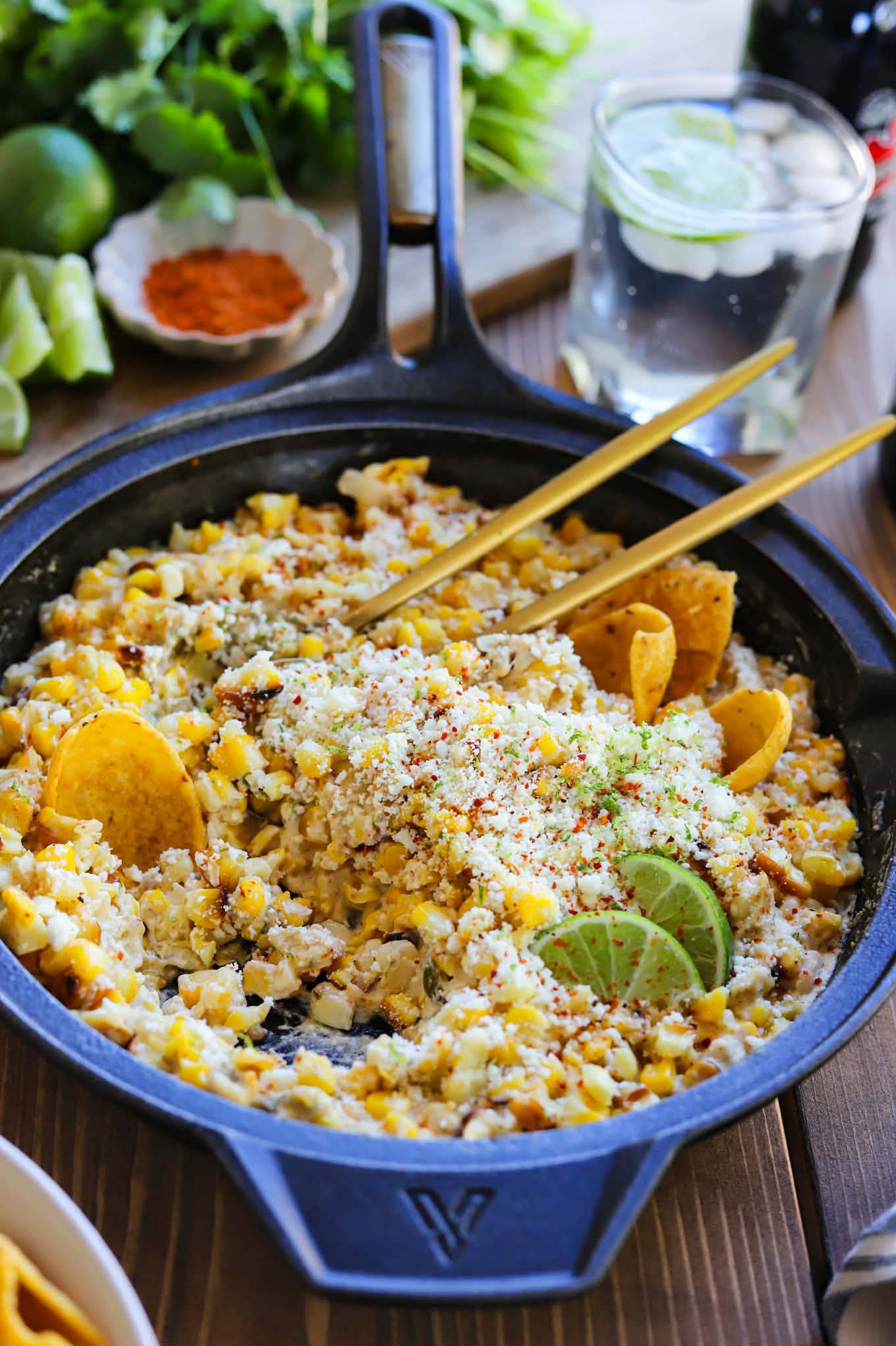 Traditionally, elote is made with white field corn that is boiled until just tender, but I prefer blistered sweet corn for this dip.