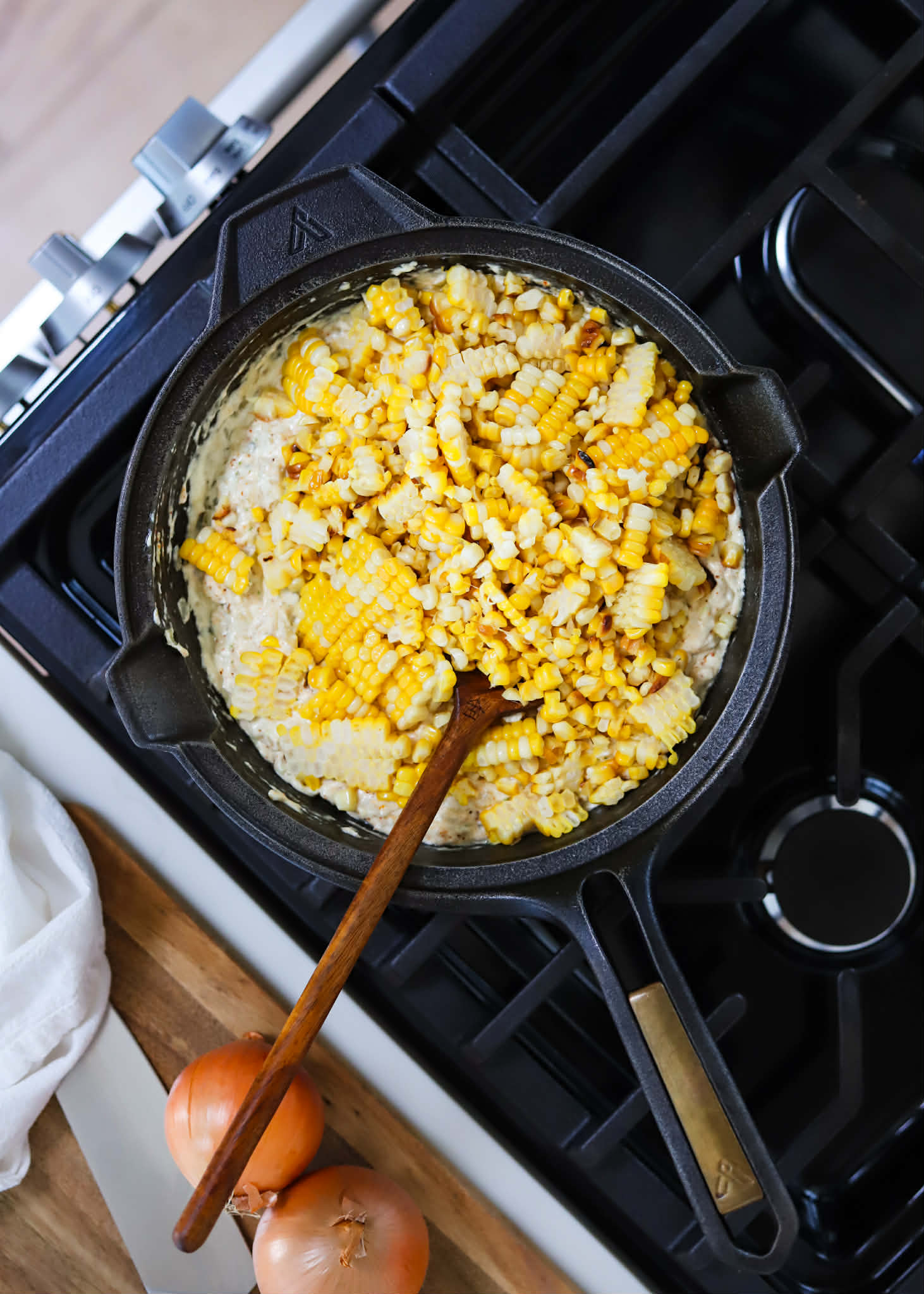 Stir in most of the corn until it is completely combined with the sauce. I like to reserve some of the blistered corn to top the dip with before serving, but this is totally optional!
