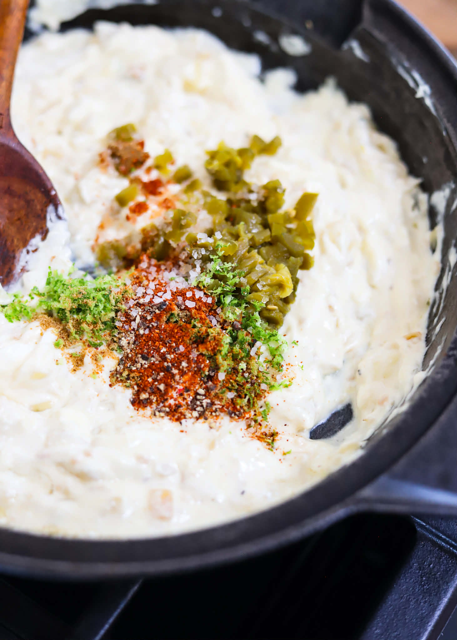 - Transfer the skillet off of the heat and stir in 1 teaspoon of fresh lime zest, 2 tablespoons of fresh lime juice, 2 tablespoons of finely minced pickled jalapeños, 1/2 teaspoon of sea salt, 1/2 teaspoon of chili powder, 1/2 teaspoon of cumin and a pinch of black pepper