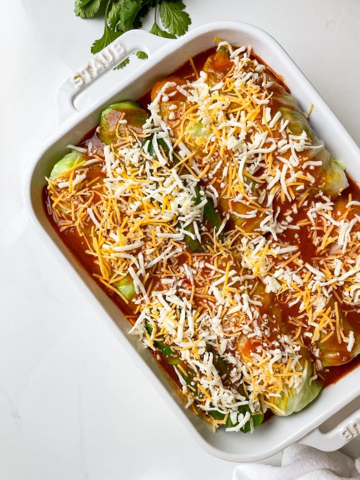 Now I happen to love cabbage, but even if you are not a huge fan of it, I still believe there is a good chance that you would love these rolls. The cabbage is filled with a flavorful beef mixture and melted cheese and then smothered in enchilada sauce and more cheese. Its really just a vessel and I think it does a super good job!