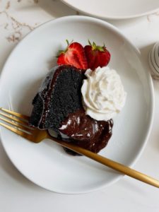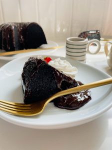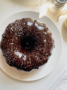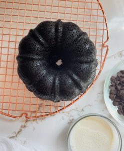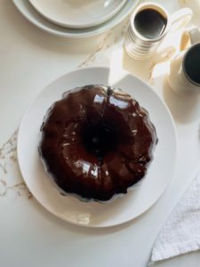 Transfer the pan onto a cooling rack for about 5 minutes before inverting the cake out of the pan directly onto the cooling rack. This cake needs to cool fully before drizzling with chocolate ganache. If you do not want to add the ganache, feel free to dig right in, but I assure you that the ganache is worth waiting for….