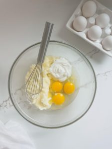 Add 1/3 cup of plain whole milk greek yogurt, 3 large eggs and 2 teaspoons of vanilla extract and mix until completely combined.