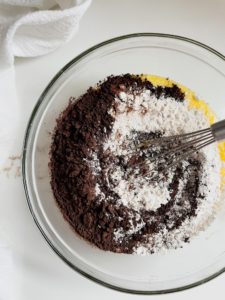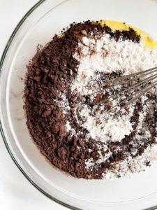 Add 1 cup of all purpose flour, 2/3 cup of black cocoa powder, 1 tablespoon of espresso powder, 1/2 teaspoon of salt and 3/4 teaspoon of baking powder and mix until mostly combined.