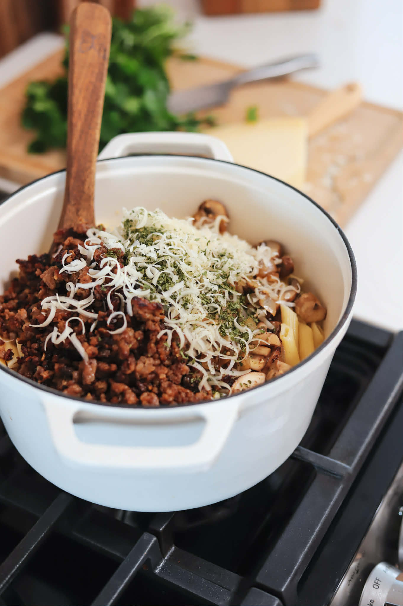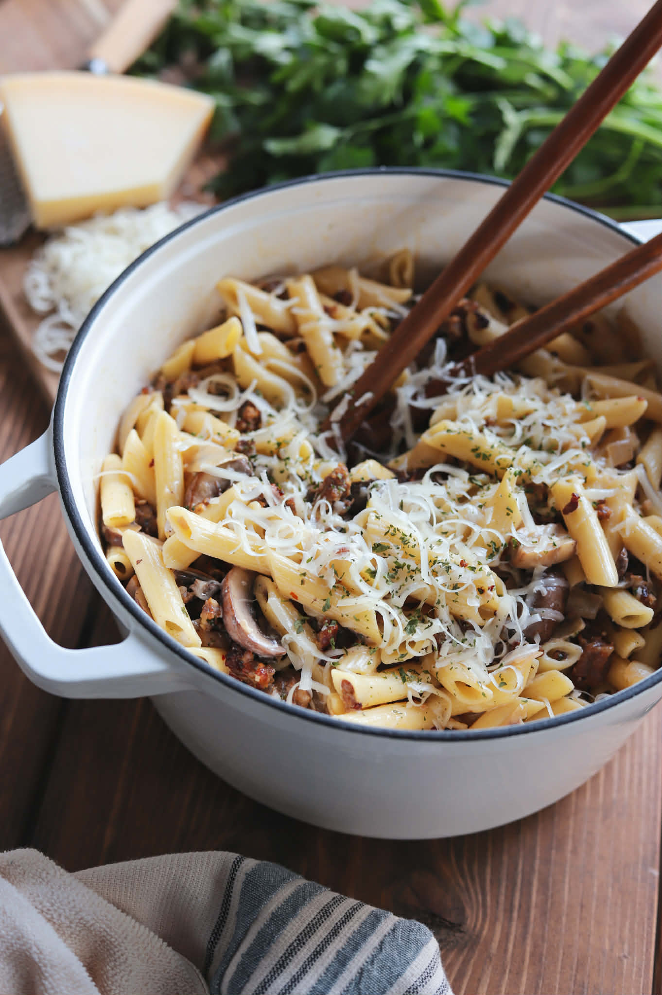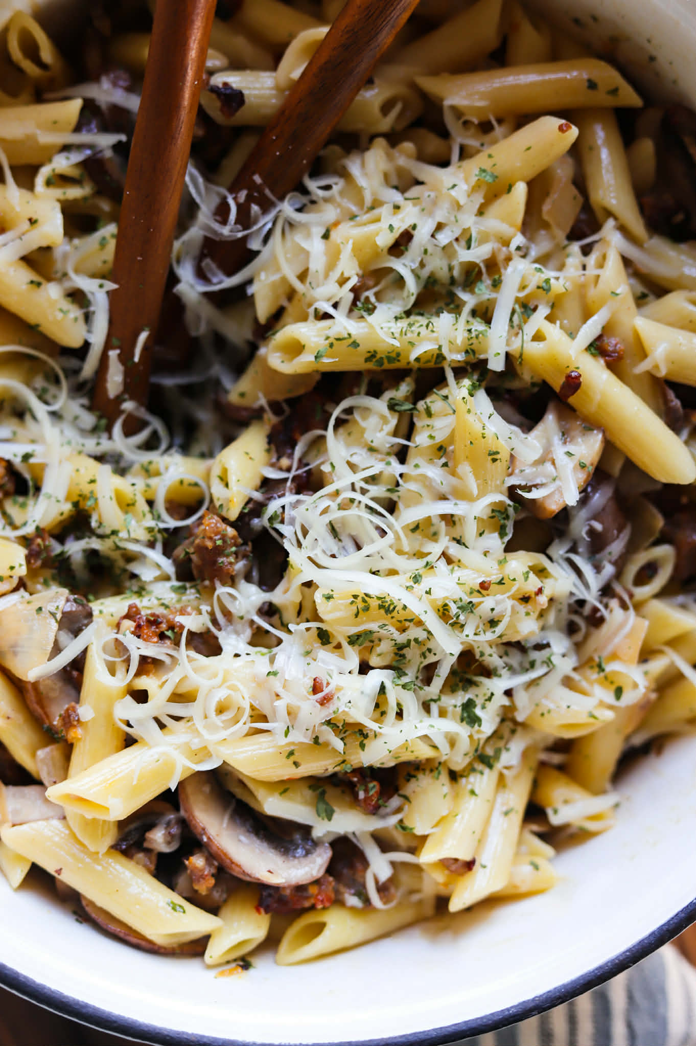 Each bite is amazing. The flavors of the warmly spiced Italian sausage, earthy mushrooms and subtly sweet onions are perfectly complimented by the light cream sauce and all of that salty parmesan. This dish is just perfect for a cozy fall or winter evening. It is so comforting and really satisfying.
