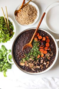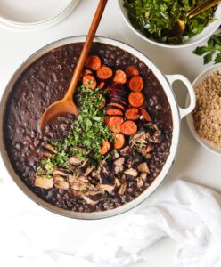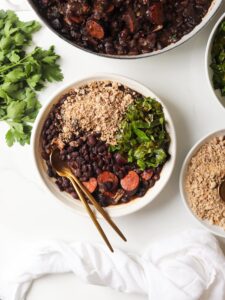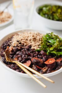 Feijoada is the national dish of Brazil and it is a super comforting black bean and pork stew that is traditionally served with couve à mineira (garlic collard greens) and farofa (toasted cassava).