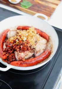 Transfer the seared spare ribs onto the plate with the bacon, garlic and onions and add your linguica.