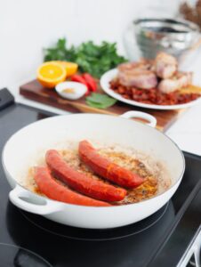 If you add the spare ribs and sausage all in at the same time, it will be tough to sear them properly, so I like to do them in batches to not overcrowd the hot surface.