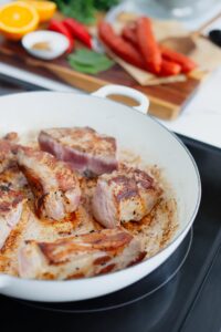Add the spare ribs into the braiser and brown them on all sides. The pork will actual cook through once everything is combined and simmered, we are just looking for a nice browned sear on the outside for now.
