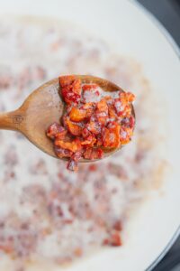 - Use a slotted spoon to transfer the bacon onto a plate and set aside for now