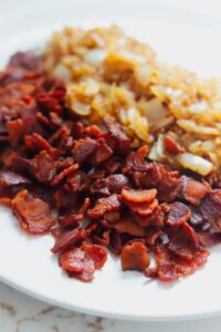 - Transfer the onions and garlic onto the plate with the bacon and set aside for now