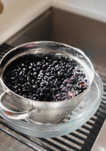 The first step is to soak the beans and carne seca. Add 32 ounces of dried black beans into a large bowl and cover with cool water. Place the carne seca (if using) in a separate bowl and cover with cool water. Place both bowls into the refrigerator for a minimum of 6 hours. I like to do this overnight.