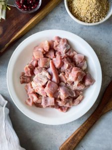 - Cut 1 1/2 pounds of boneless skinless chicken thighs into 1 inch cubes and season with salt and black pepper