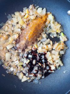 Add the diced yellow onions into the skillet and cook for about 5 minutes over medium heat. Once the onions begin to soften, add the finely minced garlic and grated ginger into the skillet and cook for another 60 seconds or so, stirring constantly.