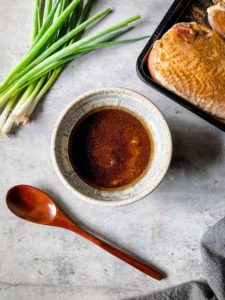 Once your 30 minute timer goes off, brush a little bit of the sticky five spice glaze over the chicken with a silicone kitchen brush and roast for another 5 minutes. Repeat this process until the skin is crisp and the chicken is cooked through with an internal temperature of 165 degrees.