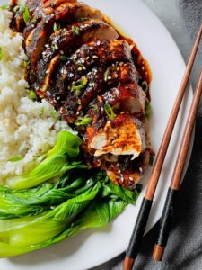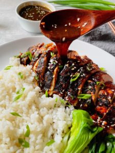 Transfer the chicken onto a cutting board to rest for 10 minutes before slicing into it. While it’s resting, reheat any of the leftover glaze in the saucepan, so it is ready to spoon over the chicken right before serving…