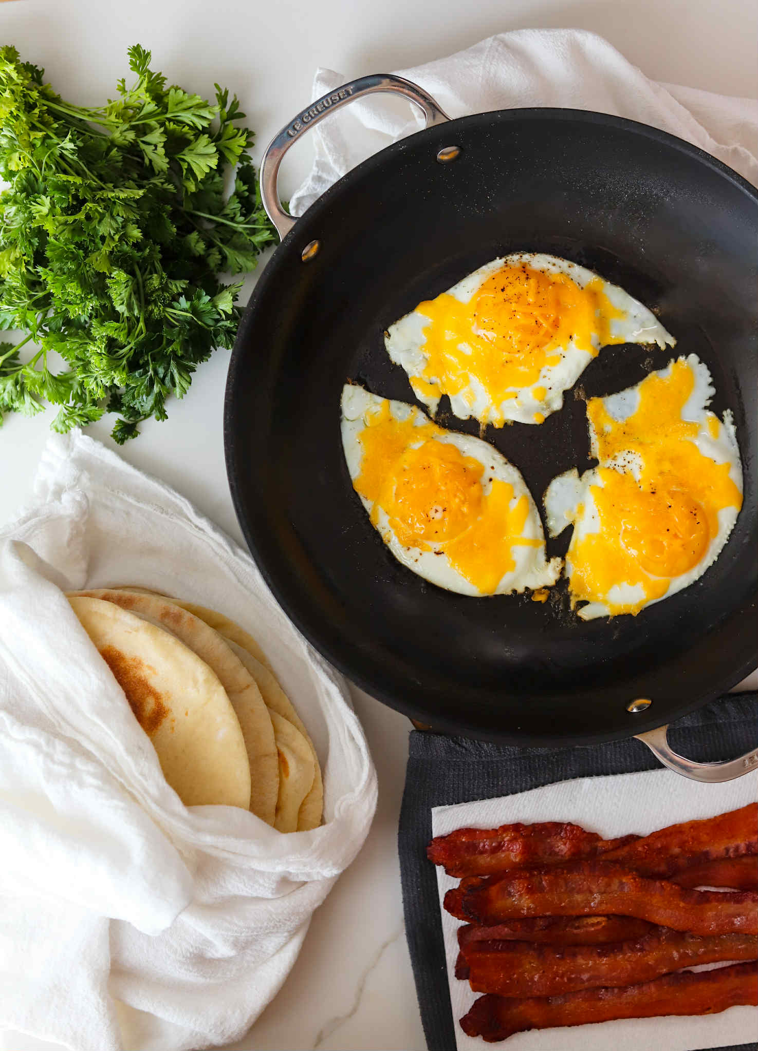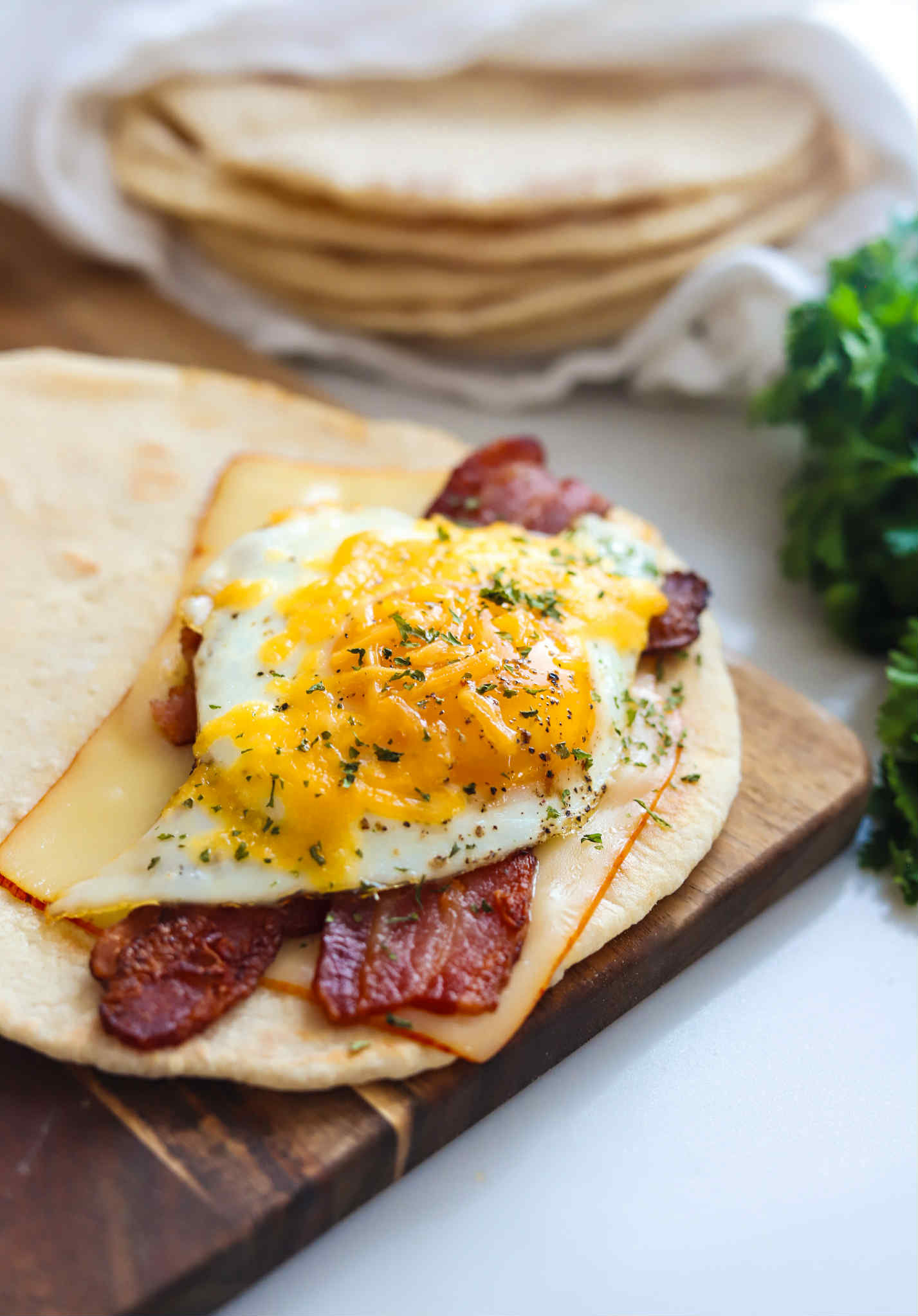 Soft flatbread filled with melted cheese, a fried egg and crispy bacon. These foldovers are simply delicious and since they come together quickly, they are great breakfast for busy mornings or to use as a meal prep breakfast for the work week.