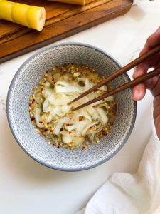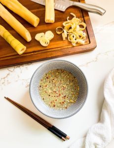 Once my bamboo was fully boiled and nicely tender, I sliced it into several different shapes for a few recipes I wanted to try. The bamboo that I wanted to pickle went straight into my pickling liquid and the other bamboo was transferred into an airtight container and stored in my refrigerator for a few days.