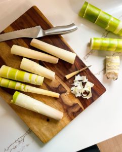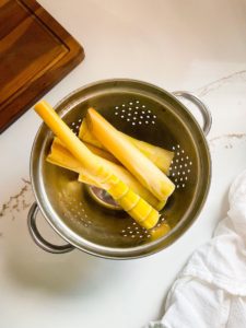 Step one is to peel the shoots. Although bamboo feels so stiff and hearty, these shoots peeled easily and felt similar to shucking corn. I peeled back everything that felt rough and then rinsed any dirt off of the shoots.