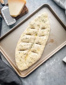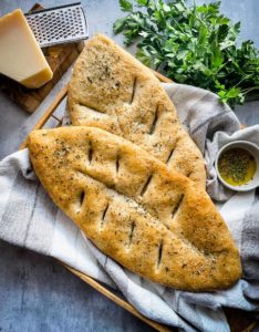 This fougasse with parmesan and herbs is great along side a big salad or a bowl of pasta. It’s fabulous dipped in a hearty tomato sauce or some oil and balsamic… or just tear off a piece and enjoy it au naturale.