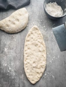Using a rolling pin or floured hands, gently work both portions out into a long oval and transfer them onto flat baking sheets.