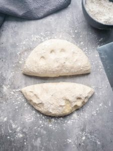 Now transfer the rested dough out onto a floured surface and divide it into 2 equal portions.