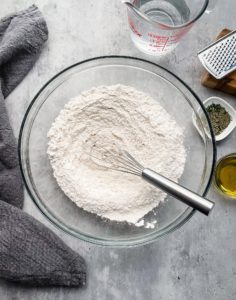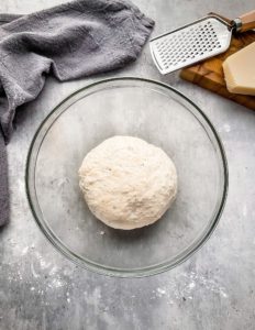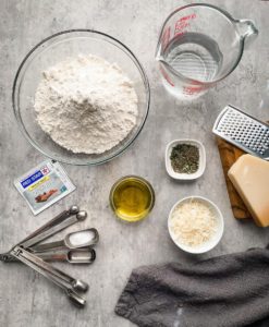 Begin by weighing out 450 grams of bread flour (about 3 cups), 6 grams of salt (1 teaspoon), 7 grams of instant yeast (1 standard packet), 75 grams of finely shredded parmesan, (about 1/2 cup), 2 tablespoons of extra virgin olive oil, 1 tablespoon of dried italian herbs and 320ml of warm water (1 1/3 cups).