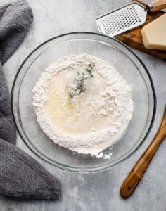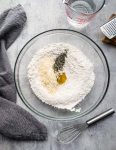 - Add 75 grams finely shredded parmesan, 1 tablespoon of dried herbs, 2 tablespoons of olive oil and 320ml of warm water and stir until a dough begins to form