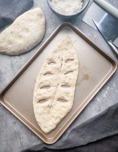- Roll the dough out into a oval and use a sharp knife to slice one line down the center of the oval and a few diagonal lines along the sides (see photos above)