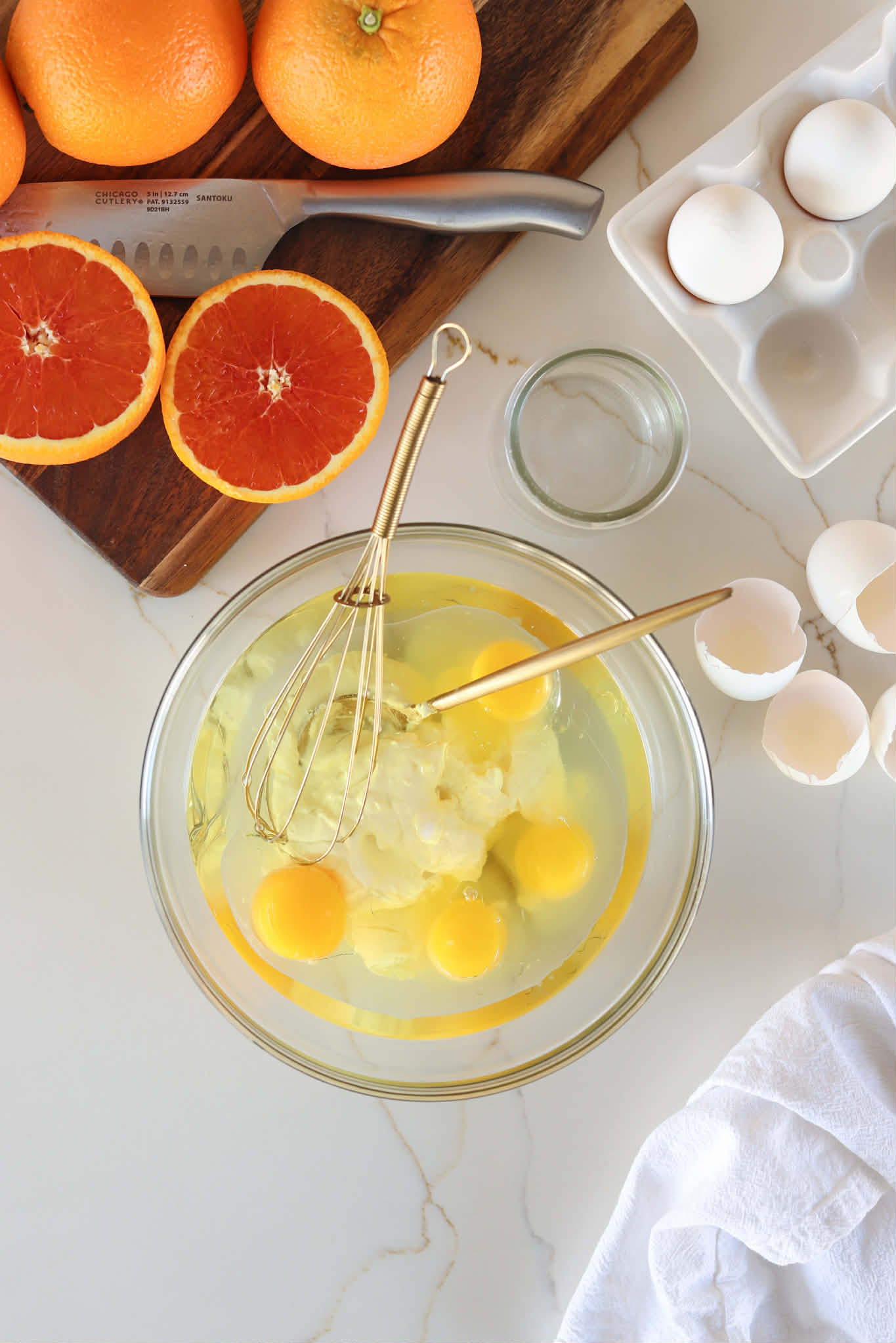 Begin by combining 1 container of yogurt, 1 container filled with a neutral oil and 4 large eggs in a large bowl. Whisk vigorously until everything is completely combined.
